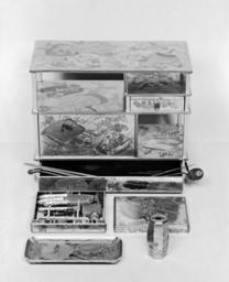 Keywords: Japanese - Cabinet for the Incense Guessing Game - Walters 67255 - Interior.jpg This ko-awase-dogu-dana or cabinet for the incense game is gold lacquer and has three shelves and three drawers containing six copper implements a brocade bag with ten paper envelopes a small tray a rectangular box and a box for the counters The cabinet has a design of leaf-shaped fans on a background of flowers of various kinds The fans are elaborately decorated with tortoises birds flowers and the scenery of Fujisan with winding streams etc The interior of the lower drawer is decorated with clouds The rectangular tray for incense Koban is of gold lacquer and rests on four low feet It has a slightly raised rim and indented corners The interior of the tray is decorated with two overlaping fans one with a flying crane and the other with a feather pattern Both appear against a floral background The rectangular box for the set of implements for cutting incense wood Kowari-dogu is of gold lacquer with an interior frame for a saw knife chisel mallet and chopping block The instruments are of steel with lacquered handles The top of the lid is decorated with two overlaping leaf-shaped fans one with a heron and the other with a butterfly and flowers Both fans appear against a background of pampas grass pinks and bush-clovers; theis same floral design continues on the exterior sides of the box The interior lid has layers of clouds The box for counters for the incense game Fuda-bako is gold lacquer octagonal and barrel-shaped The upper half of the box has an oval opening cut out and is rimmed with metal The exterior is decorated with pinks bush-clovers and pampas grass century 18 19 gold lacquer copper textile paper Cabinet cm 22 3 13 3 27 1 ; Koban cm 1 9 6 8 15 ; Kowari-dogu cm 3 1 9 6 12 3 ; Fuda-bako cm 7 3 5 accession number 67 255 24845 William T / Henry Walters Collection Baltimore date and mode of acquisition unknown Walters Art Museum Henry Walters Acquired by William T or Henry Walters place of origin Japan Walters Art Museum license Art of Japan in the Walters Art Museum Media contributed by the Walters Art Museum needs category review Kōbako