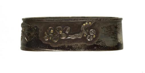 | Keywords: Japanese - Fuchi with Bamboo and Plums - Walters 5112433A - Back.jpg  The fuchi is decorated with bamboo on the front and plum blossoms on the reverse It may have originally been paired with a kashira depicting pine trees because those three plants are known as the three friends of winter This is part of a mounted set early-mid 19th century Edo shibuichi gold cm 3 9 2 1 1 2 accession number 51 1243 3A 79624 Henry Walters Baltimore date and mode of acquistion unknown Walters Art Museum Henry Walters Acquired by Henry Walters Mark Assembly mark in ink inside fuchi i jyô tsu ki place of origin Japan Walters Art Museum license Fuchi in the Walters Art Museum White background Media contributed by the Walters Art Museum needs category review |