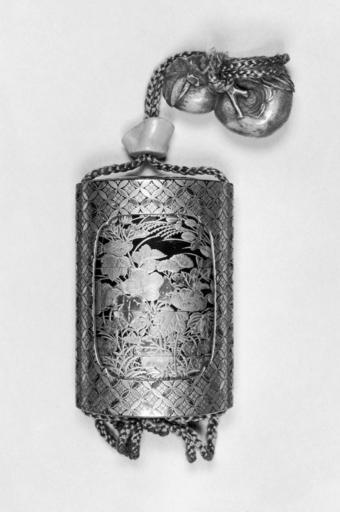 | Keywords: Japanese - Inro with Autumnal Grasses and Flowers, with Netsuke and Ojime - Walters 67423.jpg A saya standard oblong gold lacquer four compartment inro in a sheath The sheath with a hanabishi pattern Both sides of the compartments decorated with autumn flowers and grasses - Chinese bellflower kikyo chrysanthemum kiku pampass grass yarrow hibiscus and bush-clover hagi The sheath saya in gold with an inlay of aogai A background of roiro in black for the upper compartments and nashiji for the lower The interior with nashiji and fundame The cord channels are external with an ojime button of coral branch Together with a carved ivory netsuke of two persimmons kaki with an inscription on the bottom century 19 Edo; Meiji lacquer ivory coral aogai inro cm 7 4 5 2 5 accession number 67 423 27992 Exposition Universelle Paris 1878 William T Walters city Baltimore Henry Walters city Baltimore Walters Art Museum Henry Walters Acquired by William T Walters 1878 inscription seal unidentified Exposition Universelle Paris 1878 Japanese Lacquers The Walters Art Gallery Baltimore 1984 place of origin Japan Walters Art Museum license Inro in the Walters Art Museum Inro Objects displayed at the Exposition Universelle 1878 Flowers in art |