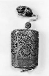 Keywords: Japanese - Inro with the Three Friends of Winter (Pine, Bamboo, and Prunus) - Walters 67538.jpg A standard oblong tsuishu lacquer four compartment inro A design of pine bamboo and prunus in tsuishu carving on a red ground The lower section of the inro with a diaper pattern of asanoha The interior in nashiji and fundame The cord channels are external Together with a lacquered wood carved netsuke in the shape of a seated shishi inu century 19 Edo; Meiji red lacquer wood silver inro cm 8 5 6 2 8 accession number 67 538 7713 William T / Henry Walters Collection Baltimore date and mode of acquisition unknown Walters Art Museum Henry Walters Acquired by William T or Henry Walters none Netsuke Miniature Sculpture of Japan place of origin Japan Walters Art Museum license Netsuke Miniature Sculpture of Japan Inro in the Walters Art Museum Bamboo in art Pines in art Prunus in art Three friends of winter |