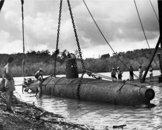 | Keywords: Japanese Ko-hyoteki class submarine raised at Guadalcanal 1945.jpg A Japanese Ko-hyoteki-class submarine raised off Cape Esperance Guadalcanal by the U S Coast Guard buoy tender USCGC Ironwood WAGL-297 in January 1945 The submarine was raised in about 10 metres of water on 20 January towed to Hutchinsons's Creek Florida Island and transferred to a crane barge on the following day LOC-image HAER AK-44-2 http //hdl loc gov/loc pnp/hhh ak0506/photos 193651p http //www uscg mil/history/webcutters/Ironwood_1943 pdf 1945-01 USCG frame removed PD-USGov Ko-hyoteki class submarine Guadalcanal Campaign |