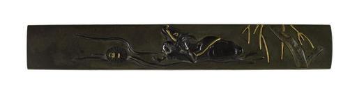 Keywords: Japanese - Kozuka with a Man on an Ox in a Stream - Walters 51655.jpg In the middle of kozuka is a ox fording stream A man holds onto the ox below its neck The man appears to be trying to reach a hat floating in the water to the left date shibuichi silvery patina gold cm 9 6 accession number 51 655 9610 Henry Walters Baltimore date and mode of acquisition unknown Walters Art Museum Henry Walters Acquired by Henry Walters none place of origin Japan Walters Art Museum license Tosogu Japanese sword fittings in the Walters Art Museum Media contributed by the Walters Art Museum needs category review