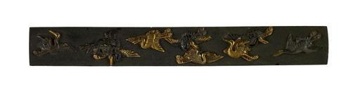 Keywords: Japanese - Kozuka with Nine Flying Cranes - Walters 51762.jpg The front of the kozuka is decorated with nine copper alloy silver and gold cranes in flight The background is in a fish egg pattern nanako-ji Cranes are a symbol of longevity and an auspicious motif This is only the decorative front plate date shakudo gold copper cm 9 5 accession number 51 762 14963 Henry Walters Baltimore date and mode of acquisition unknown Walters Art Museum Henry Walters Acquired by Henry Walters none place of origin Japan Walters Art Museum license Kozuka in the Walters Art Museum Media contributed by the Walters Art Museum needs category review |
