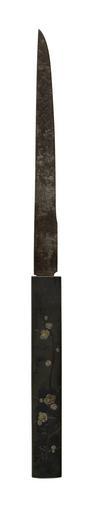 | Keywords: Japanese - Kozuka with Plum Blossoms - Walters 5111713.jpg  A branch of plum blossoms decorates the front of the kozuka Plum blossoms are the first flowers of spring to bloom This is part of a mounted set century 18 Edo shakudo silver gold steel cm 21 7 accession number 51 1171 3 5127 William T / Henry Walters Collection Baltimore date and mode of acquisition unknown Walters Art Museum Henry Walters Acquired by William T or Henry Walters Signature On blade fujiwara kunitsugu ise; Translation Fujiwara Kunitsugu of Ise place of origin Japan Walters Art Museum license Kozuka in the Walters Art Museum Media contributed by the Walters Art Museum needs category review |