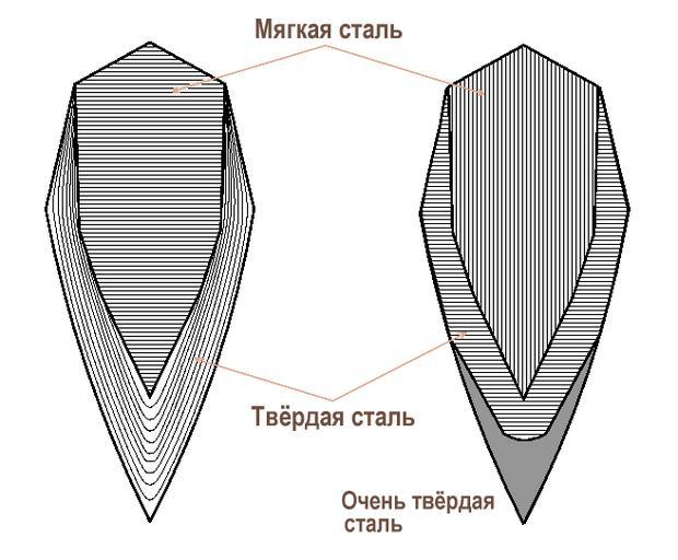 | Keywords: Japanese sword cross-section layers.png  en Cross section of japanese sword Different structures of steel layers ru Сечение типичного японского меча Показаны два  асп ост анённых ва ианта комбини ующих сталь с  азным соде жанием угле ода и  азным нап авлением слоёв стали Own Vissarion 2008 Vissarion Japanese sword blade cross sections Blades by shape Mêlée weapons |