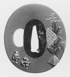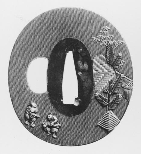 Keywords: Japanese - Tsuba with Dancers Celebrating New Year - Walters 51241.jpg The pine tree and bamboo decorations on the right side of the tsuba are part of traditional New Year's decorations Both pine and bamboo are considered felicitous Behind the pine a rope decorated with hanging straw pendants wraps around the edge of the tsuba to the reverse side At the lower left on the front are two small figures performing a manzai dance to celebrate the New Year One beats a small drum while the other dances with a fan Both wear masks The back shows the reverse side of the decorations which appear on the front Note the unusual basket weave design on the metal plugging the hole for the hair pick on the right date shakudo gold copper cm 6 4 5 8 0 36 accession number 51 241 6886 Henry Walters Baltimore date and mode of acquisition unknown Walters Art Museum Henry Walters Acquired by Henry Walters none place of origin Japan Walters Art Museum license Tsuba in the Walters Art Museum Reliefs of dancers on Japanese sword fittings Media contributed by the Walters Art Museum needs category review Manzai comedy |