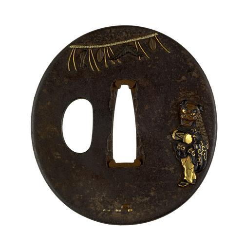 | Keywords: Japanese - Tsuba with a New Year's Lion Dancer - Walters 51365.jpg  The motifs of this tsuba illustrate traditional New Year's customs On the right is a man dressed as a lion who performs a celebratory dance At the upper left is a decorative rope shimenawa including pine boughs which are hung on homes during the New Year's season At the lower edge on the reverse is a small table with traditional offerings date iron gold copper cm 6 5 accession number 51 365 12126 Henry Walters Baltimore date and mode of acquisition unknown Walters Art Museum Henry Walters Acquired by Henry Walters none place of origin Japan Walters Art Museum license Tsuba in the Walters Art Museum Reliefs of dancers on Japanese sword fittings Media contributed by the Walters Art Museum needs category review |