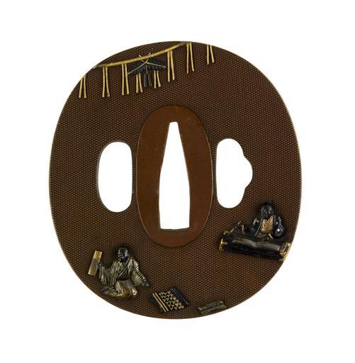| Keywords: Japanese - Tsuba with Poetry Composition at New Year's - Walters 51230.jpg  At the lower right of this tsuba a seated man dips his brush in ink A sheet of paper is spread on the tray or small table in front of him Another man sits at the lower left At the upper left and on the reverse are New Year's decorations incorporating pine boughs Pines are a symbol of longevity and feature prominently in New Year's decorations date copper gold silver shakudo cm 7 4 6 76 0 49 accession number 51 230 31466 Henry Walters Baltimore date and mode of acquisition unknown Walters Art Museum Henry Walters Acquired by Henry Walters none place of origin Japan Walters Art Museum license Tsuba in the Walters Art Museum Media contributed by the Walters Art Museum needs category review |