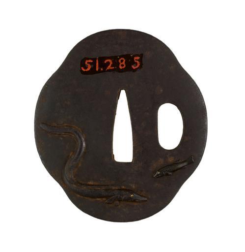 Keywords: Japanese - Tsuba with Sea Creatures - Eel, Flying Fish, Spiny Lobster, and Octopus - Walters 51285 - Back.jpg Various sea creatures crafted in different metal alloys are depicted on this tsuba Along the upper right edge is a spiny lobster which is often used as a symbol of longevity At the lower right is a flying fish An octopus occupies the lower left On the reverse are an eel and another fish along the lower edge date iron copper gold silver shakudo cm 6 33 5 69 0 55 accession number 51 285 32756 Henry Walters Baltimore date and mode of acquisition unknown Walters Art Museum Henry Walters Acquired by Henry Walters none place of origin Japan Walters Art Museum license Tsuba in the Walters Art Museum Media contributed by the Walters Art Museum needs category review |