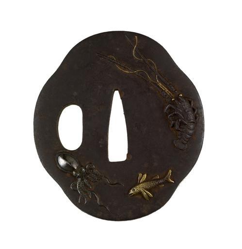 Keywords: Japanese - Tsuba with Sea Creatures - Eel, Flying Fish, Spiny Lobster, and Octopus - Walters 51285.jpg Various sea creatures crafted in different metal alloys are depicted on this tsuba Along the upper right edge is a spiny lobster which is often used as a symbol of longevity At the lower right is a flying fish An octopus occupies the lower left On the reverse are an eel and another fish along the lower edge date iron copper gold silver shakudo cm 6 33 5 69 0 55 accession number 51 285 32756 Henry Walters Baltimore date and mode of acquisition unknown Walters Art Museum Henry Walters Acquired by Henry Walters none place of origin Japan Walters Art Museum license Tsuba in the Walters Art Museum Media contributed by the Walters Art Museum needs category review Flying fish in art |