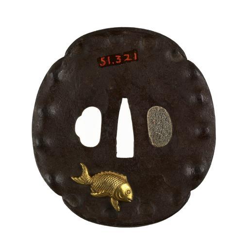 Keywords: Japanese - Tsuba with Spiny Lobster and Fish - Walters 51321 - Back.jpg This tsuba is decorated with two fish and a spiny lobster The lobster is at the upper right on the front A fish is at the lower left On the reverse is a snapper The hole for the utility knife has been plugged date iron gold copper alloy nigurome lead cm 8 8 8 1 0 56 accession number 51 321 40877 Henry Walters Baltimore date and mode of acquisition unknown Walters Art Museum Henry Walters Acquired by Henry Walters none place of origin Japan Walters Art Museum license Tsuba in the Walters Art Museum Media contributed by the Walters Art Museum needs category review |
