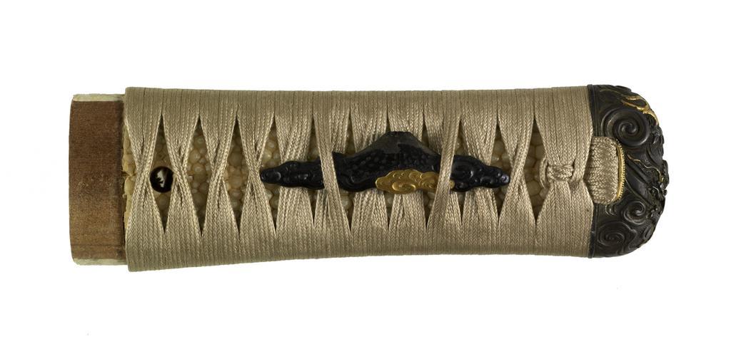 | Keywords: Japanese - Tsuka with Dragons, Clouds, and Mt Fuji - Walters 5112813B - Back.jpg The kashira on the end depicts a dragon amongst clouds with gold highlights One of the menuki is in the shape of a gold dragon flying through shakudo clouds The other depicts Mt Fuji The pairing of a dragon and Mt Fuji is an emblem of success This is part of a mounted set century 18 19 late Edo-Meiji silver ray skin gold shakudo cm 12 2 accession number 51 1281 3B 2350 Henry Walters Baltimore date and mode of acquisition unknown Walters Art Museum Henry Walters Acquired by Henry Walters none place of origin Japan Walters Art Museum license Tsuka in the Walters Art Museum Media contributed by the Walters Art Museum needs category review Media contributed by the Walters Art Museum needs artist review |