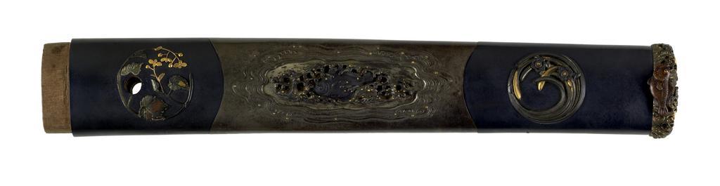 | Keywords: Japanese - Tsuka with Fish and Flowers - Walters 5112643B - Back.jpg The kashira and menuki depict various fish Both menuki are in the shape of carp On the top of the kashira a carp and a squid are shown Puffer fish are on either side of the kashira The tsuka is decorated with roundels of flowers including plum vines bush clover and iris This is part of a mounted set in which the tsuba fuchi kozuka and kogai are all signed by Ômori Hidetomo between 1742 1807 Edo black lacquer silver gold shakudo copper cm 23 8 accession number 51 1264 3B 79262 William T / Henry Walters Collection Baltimore date and mode of acquisition unknown Walters Art Museum Henry Walters Acquired by William T or Henry Walters none place of origin Sendai Japan Walters Art Museum license Tsuka in the Walters Art Museum Media contributed by the Walters Art Museum needs category review Ă”mori Hidetomo |