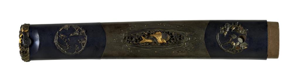 | Keywords: Japanese - Tsuka with Fish and Flowers - Walters 5112643B.jpg The kashira and menuki depict various fish Both menuki are in the shape of carp On the top of the kashira a carp and a squid are shown Puffer fish are on either side of the kashira The tsuka is decorated with roundels of flowers including plum vines bush clover and iris This is part of a mounted set in which the tsuba fuchi kozuka and kogai are all signed by Ômori Hidetomo between 1742 1807 Edo black lacquer silver gold shakudo copper cm 23 8 accession number 51 1264 3B 79262 William T / Henry Walters Collection Baltimore date and mode of acquisition unknown Walters Art Museum Henry Walters Acquired by William T or Henry Walters none place of origin Sendai Japan Walters Art Museum license Tsuka in the Walters Art Museum Media contributed by the Walters Art Museum needs category review Ă”mori Hidetomo |