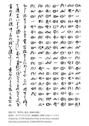 Keywords: Japanese Woshite Wajikou.svg en The WOSITE Keikou's WAJIKOU 1793 Priest at the Onjo-ji temple wrotes ja 敬光 和字 寛政5年(1793) によるヲシテの解説 鳥居礼 ホツマツタヱ入 興書院 1989/3 266ページ ISBN 4924808040 MOTOI Kenkichi 2009-12-28 PD-old Woshite