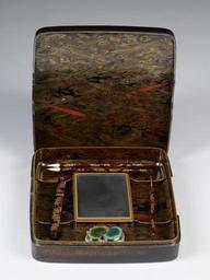 Keywords: Japanese - Writing Box and Implements (suzuri bako) with a Pheasant Beside a Stream - Walters 6775 - Open B.jpg Implements inside the box A rectangular inkstone with a depression for water is positioned in the center of the box On the right side are brushes and a stylus while on left is an encased knife used to cut paper The enamel piece above in the shape of hollyhock leaves is a water-dropper An ink stick sumi would have been included in the set The sumi is a small stick of solid ink that is turned into usable ink by grinding it on the inkstone and adding water Lid with pheasant beside a stream The inlaid silver Japanese text on the lid is a partial line from a poem in Lady Murasaki Shikibu's early 11th-century novel The Tale of Genji In chapter 29 The Royal Outing the emperor invites Genji to go hunting in the mountains outside Kyoto Genji sends his regrets that he cannot join the royal party The emperor decides to send Genji a couple of pheasants with the following poem attached Deep in the snows of Mount Oshio Are ancient pheasants' tracks Would that you might see them The box makes a poignant reference to this classical poem as it holds the tools of a poet century 18 19 Edo; Meiji box wood lacquer silver mother-of-pearl gold; paint brushes wood lacquer animal hair; water dropper silver enamel; stylus wood lacquer steel; knife wood lacquer steel; ink stone slate Lid cm 2 54 21 27 22 86 ; Bottom cm 3 81 21 27 22 86 accession number 67 75 21270 Henry Walters Baltimore date and mode of acquisition unknown Walters Art Museum Henry Walters Acquired by Henry Walters Japanese Lacquers The Walters Art Gallery Baltimore 1984 place of origin Japan Walters Art Museum license Art of Japan in the Walters Art Museum Suzuri bako
