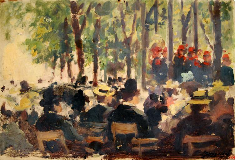 Keywords: Jardin du Luxembourg - Gaspar Miró i Lleó - 8836.JPG Artwork Creator Gaspar Miró i Lleó Jardin du Luxembourg La escena té lloc en un exterior jardí o parc En primer terme es veu un grup de senyores i senyors vestits elegantment sentats en cadires Al fons envoltats d'arbres es troba un grup de persones vestides d'uniforme soldats banda de música que semblen estar oferint algun tipus d'espectacle between Oil on canvas cm Institution Biblioteca Museu Víctor Balaguer object history exhibition history credit line accession number 8836 place of creation París Biblioteca Museu Víctor Balaguer-cooperation PD-Art PD-old-100-1923 Uploaded with UploadWizard Paintings in the Biblioteca Museu Víctor Balaguer Art of Catalonia Historical images of the Jardin du Luxembourg Gaspar Miró i Lleó