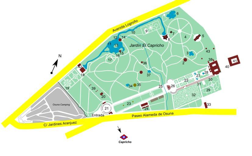 | Keywords: Jardin El Capricho.png en Jardín El Capricho Madrid Spain Own Xauxa Håkan Svensson 2008-07-04 Image Jardin_El_Capricho svg Legend Español 1 Palacio 2 Templete 3 Estanque de los Cisnes 4 Rueda de Saturno Obelisco 5 Abejero 6 Estanque de las Tencas 7 Ruina o casa del Artillero 8 Batería o Fortín 9 Zona de juegos 10 Ría 11 Lago 12 Puente de Hierro 13 Isla y monumento al III Duque de Osuna 14 Casa de Cañas 15 Pabellón de Esteras 16 Quiosco Embarcadero 17 Montaña Rusa 18 Casino de Baile 19 Jardín de Flores 20 Casa de la Vieja 21 Plaza de Toros 22 Parterre 23 Columnas de los enfrentados Duelistas 24 Invernadero 25 Puente sobre el arroyo 26 Exedra y Plaza de los Emperadores 27 Estanques del Parterre 28 Fuente de los Delfines 29 Jardín de la Fuente de las Ranas 30 Gruta del Jardín de las Fuente de las Ranas 31 Gruta del Laberinto 32 Laberinto 33 Casa de Vacas 34 Estanque nuevo 35 Plaza de plátanos 36 Ermita 37 Estanque de los patos 38 Refugio Bunker 39 Polvorín 40 Plaza de la fuente 41 Casa de oficios 42 Aseos públicos 43 Ventiladores del bunker Svenska 1 Palats 2 Tempel 3 Svandammen 4 Saturnus hjul Obelisk 5 Biodling 6 Sutaredammen 7 Ruin eller artillerihuset 8 Batteriet eller Fästningen 9 Lekplatsen 10 Floden 11 Sjön 12 Järnbron 13 Ö och monument över Hertigen III av Osuna 14 Bambuhuset 15 Vasspaviljongen 16 Hamnkiosken 17 Berg- och dalbanan 18 Danssalongen 19 Blomsterträdgården 20 Den gamla kvinnans hus 21 Tjurfäktningsarenan 22 Parterren 23 Duellanternas två pelare 24 Växthus 25 Bron över bäcken 26 Exedra och Kejsarnas torg 27 Parterrbassängen 28 Delfinfontänen 29 Trädgården med grodfontänen 30 Grottan vid trädgården med grodfontänen 31 Grottan vid labyrinten 32 Labyrinten 33 Ladugården 34 Nya bassängen 35 Platsen med platanerna 36 Ermita helgonkapell 37 Ankdammen 38 Skyddsrum Bunker 39 Krutmagasin 40 Fontänplatsen 41 Hantverkshuset 42 Toaletter 43 Ventilationsskorstenar för skyddsrummen French 1 Palais 2 Templete 3 Étang aux cygnes 4 Roue de Saturne Obélisque 5 Ruches 6 Étang des tanches 7 Ruine ou maison de l'artilleur 8 Batterie ou fortin 9 Zone de jeu 10 Ria 11 Lac 12 Pont de fer 13 Île et monument au troisième duc d'Osuna 14 Maison de roseaux 15 Pavillon de nattes 16 kiosque et embarcadère 17 Montagne Russe 18 kiosque de danse 19 Jardin de fleurs 20 Maison de la vieille 21 Arènes 22 Parterre 23 Colonne des duellistes 24 Hibernarium 25 Pont sur le ravin 26 Exèdre et Places des Empereurs 27 Étang du Parterre 28 Fontaine aux dauphins 29 Jardin de la source aux grenouilles 30 Grotte du Jardin de la source aux grenouilles 31 Grotte du labyrinthe 32 labyrinthe 33 Maison aux vaches 34 nouvel étang 35 Place aux platanes 36 Ermitage 37 Étang aux canards 38 Refuge bunker 39 Poudrière 40 Place de la fontaine 41 Maison des officiers 42 Toilettes publiques 43 Ventilateurs du bunker El Capricho garden Park plans |