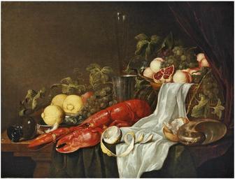 | Keywords: Jasper Geeraerts - A lobster, a partly-peeled lemon, a basket of fruit, bread, a conch shell and an upturned roemer, with other fruit and vessels on a party-draped table.jpg  Artwork creator Jasper Geeraerts en A lobster a partly-peeled lemon a basket of fruit bread a conch shell and an upturned roemer with other fruit and vessels on a party-draped table 1634-1654 http //www christies com/LotFinder/lot_details aspx intObjectID 5193891 oil canvas cm 74 4 97 3 object history credit line signed 'IASPER GERADI_ ' lower left on the table Sold at Christie's on 24 April 2009 London lot 23 PD-old-100 Jasper Geeraards Baroque still life paintings of fruit Oil still life paintings Paintings of lobsters Paintings of lemons Still life paintings of bread Rummers in paintings |