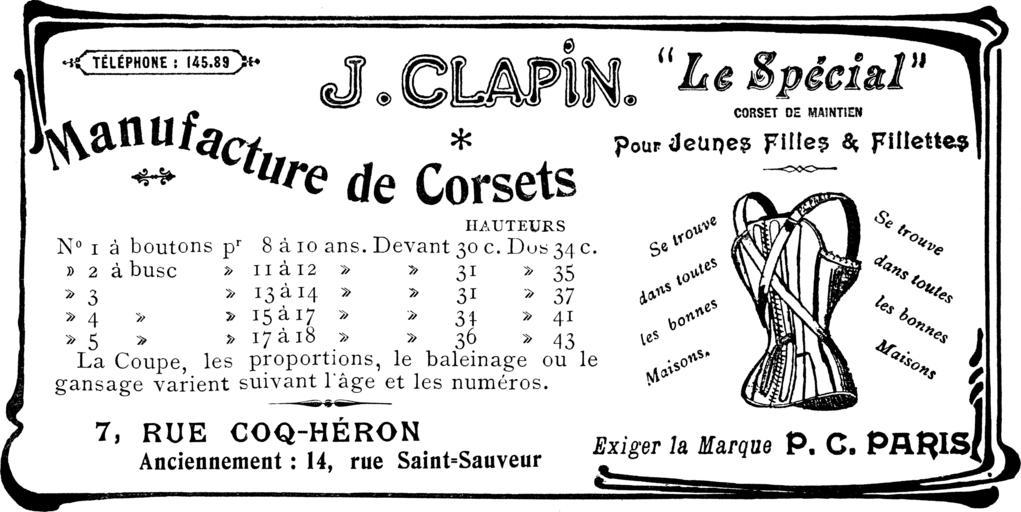 | Keywords: JClapinLeSpecialCorsetDeMaintien.png J Clapin; Le Spécial Corset De Maintien Pour Jeunes Filles Fillettes; Se trouves dans toutes les bonnes Maisons Les Dessous Élégants; N° 8 page II AOUT 1904 Anonymous PD <TABLE BORDER 0 ><TR><TD> <br>N° </TD><TD> - </TD><TD> HAUTEURS <br>Devant </TD><TD> HAUTEURS <br>Dos </TD></TR><TR><TD> 1 à boutons </TD><TD> p<sup>r</sup> 8 à 10 ans </TD><TD> 30 c </TD><TD> 34 c </TD></TR><TR><TD> 2 à busc </TD><TD> p<sup>r</sup> 11 à 12 ans </TD><TD> 31 c </TD><TD> 35 c </TD></TR><TR><TD> 3 à busc </TD><TD> p<sup>r</sup> 13 à 14 ans </TD><TD> 31 c </TD><TD> 37 c </TD></TR><TR><TD> 4 à busc </TD><TD> p<sup>r</sup> 15 à 17 ans </TD><TD> 34 c </TD><TD> 41 c </TD></TR><TR><TD> 5 à busc </TD><TD> p<sup>r</sup> 17 à 18 ans </TD><TD> 36 c </TD><TD> 43 c </TD></TR> </TABLE> La Coupe les proportions le baleinage ou le gansage varient suivant l'age et les numéros PD-old Dessous Elegants 1904 Corset advertisements Shoulder corsets Corsets for children |
