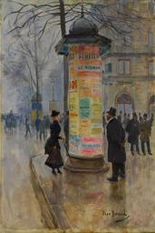 Keywords: Jean Béraud, Parisian Street Scene.jpg Artwork Creator Jean Béraud This painting shows a view of a Parisian street corner on a gray winter day A typical Parisian scene as Beraud ™s straightforward paintings most commonly were this painting evokes bustling activity in the background and an exchange of gazes in the foreground A stylish woman dressed in black peruses a poster-covered kiosk its orange tones contrasting to the otherwise silvery tones of the painting To her right another man who momentarily appears to be doing the same actually gazes in her direction He is joined by another man who peers from behind the kiosk to admire the woman ™s fashionable beauty This woman is the only female shown in the painting as men fill the background with movement and conversation Beraud ™s representation of this street scene is so precise that its location in Paris can be identified as a view of the boulevard des Italiens from the corner of rue Laffitte c 1885 Oil panel cm 38 7 26 8 Institution Metropolitan Museum of Art exhibition history credit line Robert Lehman Collection 1975 Signed lower right Jean Béraud accession number 1975 1 243 http //www metmuseum org/collections/search-the-collections/150000227 The Metropolitan Museum of Art PD-old-auto 1935 Paintings of Paris by Jean Béraud Paintings of Paris streets Colonnes Morris in Paris Historical images of Boulevard des Italiens Rue Laffitte Paris 1885 in Paris Images of Paris from the Metropolitan Museum of Art Lehman Collection French paintings in the Metropolitan Museum of Art |
