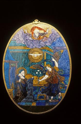 | Keywords: Jean Limosin I - Oval Plaque with the Annunciation - Walters 44346.jpg The style of the composition suggests that this plaque like its companion Plaque with the Resurrection of Christ Walters 44 345 is based on an engraving after a design by the Flemish painter Martin de Vos 1532-1603 ; however a specific model has not been identified The Latin inscription translates The Holy Ghost shall come upon thee and the power of the Most High shall overshadow thee And therefore also the Holy which shall be born of thee shall be called the Son of God Jean Limosin signed this finely worked piece and dated it 1605 His effort to balance the definition of space with the decorative qualities of the enamel can be contrasted to the frankly decorative approach of Suzanne de Court's treatment of the same composition to the right His handling of the translucent enamel is not as subtle The frames on the companion plaques are original and indicate that they were hung as independent works of art 1605 Baroque technique painted enamel copper cm 32 24 3 accession number 44 346 38273 Formerly in a château near Montauban France Henri Daguerre Paris date and mode of acquisition unknown Henry Walters city Baltimore Walters Art Museum Henry Walters Acquired by Henry Walters 1928 place of origin Limoges France Walters Art Museum license Baroque art in the Walters Art Museum Jean I Limosin Media contributed by the Walters Art Museum needs category review Painted enamel art in the Walters Art Museum |