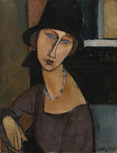 Keywords: Jeanne Hébuterne (au chapeau) by Amedeo Modigliani.jpg Jeanne Hébuterne au chapeau 1917 oil panel cm 67 51 5 Modigliani signature lower right object history Leopold Zborowski Paris<br/>Galerie Bing Paris<br/>Jonas Netter Paris in 1929 <br/>Frank Crowninshield New York 1938 <br/>Etienne Bignou Paris<br/>Belien Brussels in 1953 <br/>Edward A Bragaline in 1971 <br/>Private Collection sold Sotheby's New York May 1 1996 lot 44 <br/>Acquired at the above sale by the late owner exhibition history New York De Hauke Co Paintings by Amedeo Modigliani 1929 no 26 New York Wildenstein Co Great Portraits from Impressionism to Modernism 1938 no 26 Brussels Palais des Beaux-Arts La Femme dans l'art français 1953 no 92 New York Acquavella Galleries Amedeo Modigliani 1971 no 22 illustrated in color in the catalogue titled Madame Hébuterne à la cloche http //www sothebys com/en/auctions/ecatalogue/2010/impressionist-modern-art-evening-sale-n08675/lot 14 html Sotheby's New York 02 November 2010 lot 14 PD-old-auto-1923 1920 DEFAULTSORT Modigliani; Portrait female 1917 Hébuterne; Sotheby's 2010 Paintings of women by Amedeo Modigliani Jeanne Hébuterne Portrait paintings of females 20th-century portrait paintings location missing 1917 portrait paintings 20th-century oil on panel paintings 20th-century oil portraits of women at bust length 1917 Cloche hats Images from Sotheby's Portrait paintings of women wearing hats Image overwrites by Jan Arkesteijn for independent review |