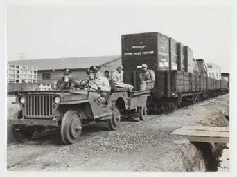 Keywords: Jeep train in Brisbane.jpg en Jeep switch engine used by soldiers during a test run on a 1 meter narrow gauge track in Brisbane Australia on 30 June 1943 A ¼ ton jeep fitted with rail wheels can easily pull 20 000 000 pounds The main purpose of these rail jeeps was to haul flatcars loaded with supplies in New Guinea This demonstration was held at Eagle Farm Aerodrome in Brisbane Australia At the wheel is Brig Gen C W Connell Commanding General Air Service Command To his right are LTC Donald Thomas Boise Idaho and LTC R L Fry Pocatella Idaho Brisbane Australia 30 June 1943 See http //www team-bhp com/forum/attachments/4x4-vehicles/108924d1236364355-willys-mb-ford-gpw-meter-gauge-tracks-willysmb001 jpg www team-bhp com/ de Demonstration auf einer Schmalspurbahn mit 1000 mm Spurweite im Eagle Farm Aerodrome in Brisbane Australien am 30 Juni 1943 durch australische und amerikanische Soldaten Der 250 kg schwere Jeep auf Eisenbahnrädern konnte leicht eine Last von 10 Tonnen ziehen was für den Einsatz in Neuguinea geplant war 1943-06-30 http //militarymashup com/mmu_get_jpeg php 1b63e4993b49286b3154615b109c621d0 http //militarymashup com/ author other versions Custom license marker 2015 07 14 PD-Australia Uploaded with UploadWizard Rail Jeep Narrow gauge railways in Australia