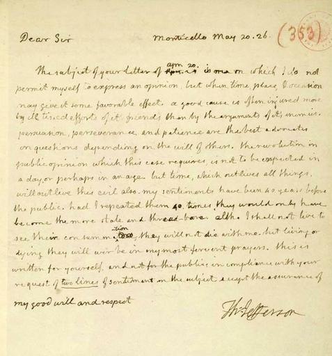 | Keywords: Jefferson Heaton letter 1826.jpg <big>Thomas Jefferson</big> to <big>James Heaton</big> May 20 1826 ---- <big>Jefferson's public silence on slavery </big><br> In a letter to James Heaton Whig state representative from Ohio Thomas Jefferson explained his public stance on slavery Near the end of his life Jefferson justified his inaction for trying to end slavery during his presidency with the following explanation in a letter to James Heaton <ref> cite web Library of Congress Thomas Jefferson Legacy July 25 2014 http //www loc gov/exhibits/jefferson/jeffleg html </ref><br><br> <big>DEAR SIR -- Monticello May 20 26<br><br>The subject of your letter of April 20 is one on which I do not<br>permit myself to express an opinion but when time place and occasion<br>may give it some favorable effect A good cause is often injured more<br> by ill-timed efforts of its friends than by the arguments of its enemies <br>Persuasion perseverance and patience are the best advocates<br>on questions depending on the will of others The revolution in<br>public opinion which this cause requires is not to be expected in<br>a day or perhaps in an age; but time which outlives all things <br>will outlive this evil also My sentiments have been forty years before<br>the public Had I repeated them forty times they would only have<br>become the more stale and threadbare Although I shall not live to<br>see them consummated they will not die with me; but living or<br>dying they will ever be in my most fervent prayer This is<br>written for yourself and not for the public in compliance with your<br>request of two lines of sentiment on the subject Accept the assurance of<br>my good will and respect </big><br> -- <big>Thomas Jefferson </big><br><br> <small>Note</small> <references/> ---- May 20 1826 Library of Congress Thomas Jefferson PD-Art PD-old-100 Uploaded with UploadWizard Letters by Thomas Jefferson Letters of the United States |