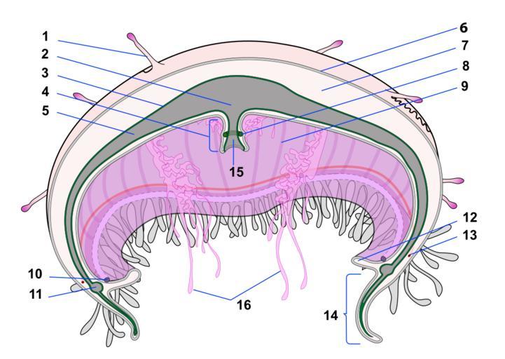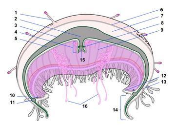 | Keywords: Jellyfish cross section numbered.svg  numbered version of Image Cross section jellyfish en svg Diagram of a cross section of a jellyfish Olindias formosa showing the main parts of a jellyfish Labels Primary tentacle Stomach Gastrodermis Manubrium incorrectly showed since it is much more longer in this species Radial canal Epidermis Mesoglea Manubrial nerve ring Centripetal canal Inner nerve ring Circular canal Velum Outer nerve ring Secondary tentacle Mouth/Anus Gonad incorrectly showed since gonads adjoin circular canals in this species Made myself using this sources http //www infovisual info/02/012_en html http //animals howstuffworks com/marine-life/jellyfish htm http //www lifesci ucsb edu/~mcdougal/neurobehavior/modules_homework/jellies html http //en wikipedia org/wiki/Jellyfish Image Hydromedusa svg http //photo net/photo/pcd1628/monterey-aquarium-jellyfish-29 Olindias formosa 2008-08-11 Mariana Ruiz Villarreal LadyofHats LadyofHats Other versions/Cross section jellyfish Philip Greenspun illustration project Diagrams labelled with numbers only Olindias formosa Cnidaria internal anatomy schemes whole body SVG anatomy |
