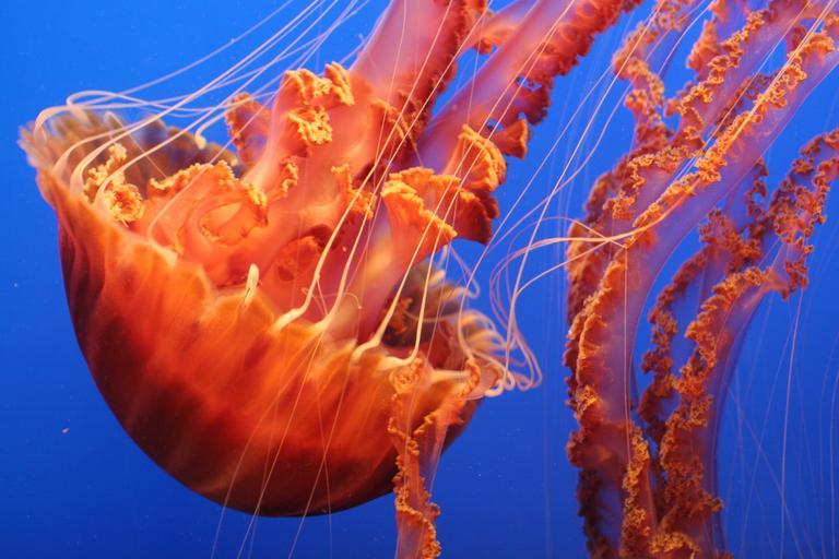 Keywords: jellyfish tentacles sea blue jelly marine ocean ocean life orange reef underwater sea life water striped
