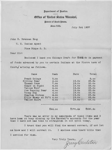 Keywords: Jerry Carleton to John R. Brennan - NARA - 285004.tif Scope and content This is document pertains to Murder of Pugh Brave Heart April 12 1907 to July 3 1907 General notes Account of funds advanced to Indians appearing at Pierre South Dakota court 285004 Local identifier Department of the Interior Office of Indian Affairs Pine Ridge Agency 1878 - 09/17/1947 NARA's Central Plains Region Kansas City NREA 400 West Pershing Road Kansas City MO 64108 1907-07-03 Record group Record Group 75 Records of the Bureau of Indian Affairs 1793 - 1999 Record group ARC 404 Records of Controversies compiled 04/01/1867 - 1879 Series ARC 284971 File unit Murder of Pugh Brave Heart 04/12/1907 - 07/03/1907 File unit ARC 284989 Variant control numbers NAIL Control Number NRE-75-67-BB-15 yes Other versions NARA-cooperation PD-USGov Documents in English |