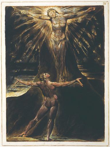 | Keywords: Jerusalem The Emanation of The Giant Albion, copy E, object 76 (Bentley 76, Erdman 76, Keynes 76).jpg  en Jerusalem The Emanation of The Giant Albion copy E object 76 Bentley 76 Erdman 76 Keynes 76 Facing away from the viewer with his legs spread and arms raised horizontally a nude male with short curly hair stands on a strip of grass at the foot of a large tree looking almost straight up at the body of a long-haired bearded male with loincloth very bright halo and crown of thorns crucified on its branches The arm positions of the two figures are similar Nails or spikes are visible in the hands and feet of the crucified figure whose eyes are closed and whose head rests on his right shoulder suggesting that he may be dead The two figures are identified on other impressions of this plate as Albion below and Jesus above but the names are variously obscured in different copies and invisible here The tree judging from its leaves and trunk appears to be an oak and its fruit is thus presumably acorns but lit and colored in a way that makes them seem golden and ”especially on the right ”so as to make them look more like apples perhaps recollecting the fateful tree in Eden The scene is dark as if at night; streaks of light in the sky and a lighted area above the horizon on the left suggest that the time is sunrise or sunset 2003-02-15 14 16 41 Institution William Blake Archive http //www blakearchive org/exist/blake/archive/object xq objectid jerusalem e illbk 76 java no Creator William Blake PD-old-100 Uploaded with UploadWizard Jerusalem The Emanation of the Giant Albion - copy E 076 Loincloths in art |