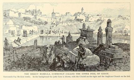 | Keywords: Jerusalem mamilla pool 1880.jpg smallcaps the birket mamilla commonly called the upper pool of gihon <br>Surrounded by Moslem tombs In the background the Jaffa Gate is shown with the Citadel on the right and the Anglican Church on the left https //archive org/stream/picturesquepales01wils_0 page/5/mode/2up Picturesque Palestine Sinai and Egypt Vol I https //archive org/stream/picturesquepales01wils_0 page/102/mode/2up p 102 New York D Appleton Co 1881 Harry Fenn PD-US PD-100 PD-100 Mamilla pool Mamilla Cemetery Jerusalem in art Picturesque Palestine Sinai and Egypt Harry Fenn Graves in art Cripples in art Jaffa Gate Jerusalem in the 1870s ImageNote 1 352 114 51 61 980 605 2 Jaffa Gate ImageNoteEnd 1 ImageNote 2 162 38 180 102 980 605 2 Anglican Church at Jerusalem ImageNoteEnd 2 ImageNote 3 538 27 129 97 980 605 2 Citadel of Jerusalem ImageNoteEnd 3 ImageNote 4 854 305 107 127 2307 1380 2 Jaffa Gate ImageNoteEnd 4 ImageNote 5 427 161 340 173 2307 1380 2 Anglican Church of Jerusalem ImageNoteEnd 5 ImageNote 6 1246 127 265 230 2307 1380 2 Jerusalem Citadel<br>or<br>Tower of David ImageNoteEnd 6 ImageNote 7 707 637 164 124 2307 1380 2 Upper Pool of Gihon<br>or<br>Birket Mamilla<br>or<br>Mamilla Pool ImageNoteEnd 7 |