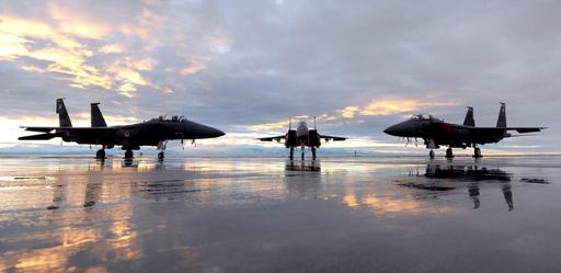 Keywords: jets aircraft military f-15 strike eagles airplanes planes aviation fighter flight line ground sunset dusk evening