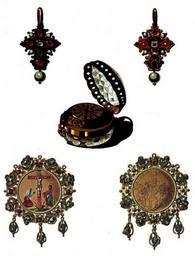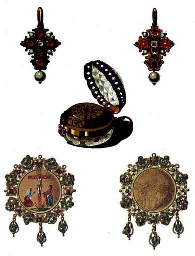 | Keywords: Jewels of Sigismund III of Poland.jpg 1 Watch of Sigismund III of Poland <br> 2 Pendant cross of Sigismund III of Poland <br> 3 Ewa Holin's medallion 1 Zegarek Zygmunta III <br> 2 Krzyżyk Zygmunta III <br> 3 Medalion Ewy Holin author century 17 1 Gold crystal enamel<br> 2 Gold enamel rubies diamonds pearls<br> 3 Gold enamel semi-precious stones Owned by The Museum of the Czartoryski Princes in Kraków lost 1939 Object history Alexander Przezdziecki Edward Rastawiecki 1858 Wzory sztuki średniowiecznej i z epoki odrodzenia po koniec wieku XVII w dawnej Polsce J Unger Publishing house Engraving - Unknown < 1858 PD-old-100 Royal Casket Jewels from the Polish Vasa Collection Jewellery of Poland Fob watches 17th-century watches |