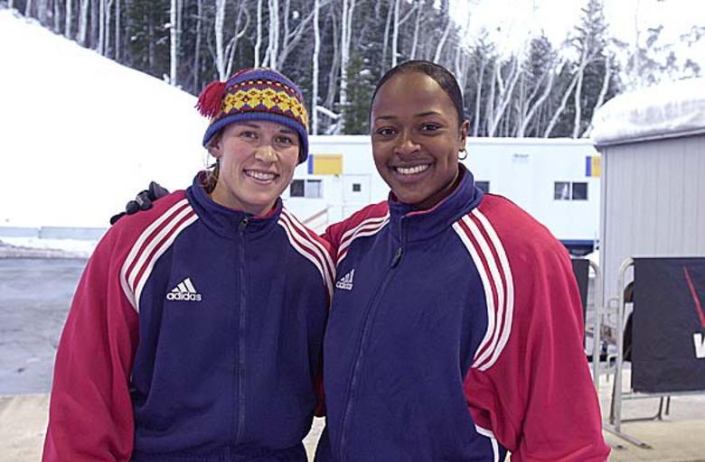 | Keywords: Jill Bakken Vonetta Flowers.jpg Spc Jill Bakken of the Utah Army National Guard left and her civilian brakeman-pusher Vonetta Flowers adopt a pre-race pose before negotiating the 16-turn Olympic bobsled track and capturing first place and gold Their victory Feb 19 2002 marked the first time America has won a medal in any Olympic bobsledding event since 1956 Flowers became the first African American to win a Winter Olympic gold medal Photo by Master Sgt Bob Haskell USARNG Source http //www defenselink mil/specials/olympics2002/index html PD-USGov-Military-Navy Bobsleigh at the 2002 Winter Olympics Jill Bakken Vonetta Flowers Photographs taken on 2002-02-19 |