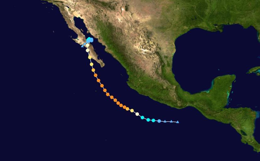 Keywords: Jimena 2009 track.png Track map of Hurricane Jimena of the 2009 Pacific hurricane season The points show the location of the storm at 6-hour intervals The colour represents the storm's maximum sustained wind speeds as classified in the Saffir-Simpson Hurricane Scale see below and the shape of the data points represent the nature of the storm according to the legend below User Nilfanion/Tc/T Created by Cyclonebiskit using Wikipedia WikiProject Tropical cyclones/Tracks The background image is from NASA Tracking data switch source from the National Hurricane Center <sup>http //www nhc noaa gov/pastall shtml</sup> from the Central Pacific Hurricane Center <sup>http //www prh noaa gov/cphc/summaries/</sup> from the Joint Typhoon Warning Center <sup>https //metocph nmci navy mil/jtwc/best_tracks/</sup> from the Japan Meteorological Agency <sup>http //www jma go jp/jma/jma-eng/jma-center/rsmc-hp-pub-eg/besttrack html</sup> from the National Hurricane Center <sup>http //www nhc noaa gov/pastall shtml and the Central Pacific Hurricane Center http //www prh noaa gov/cphc/summaries/</sup> from the Central Pacific Hurricane Center <sup>http //www prh noaa gov/cphc/summaries/ and the Joint Typhoon Warning Center https //metocph nmci navy mil/jtwc/best_tracks/</sup> from the w National Hurricane Center <sup>http //www nhc noaa gov/pastall shtml</sup> or the Joint Typhoon Warning Center <sup>https //metocph nmci navy mil/jtwc/best_tracks/</sup> 2009-08-29 Cyclonebiskit Hurricane Jimena 2009 2009 Pacific hurricane season track maps |