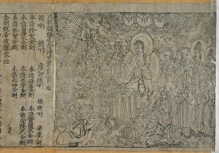 | Keywords: Jingangjing.jpg  Frontispiece Diamond Sutra from Cave 17 Dunhuang ink on paper A page from the Diamond Sutra printed in the 9th year of Xiantong Era of the Tang Dynasty i e 868 CE Currently located in the British Library London According to the British Library it is the earliest complete survival of a dated printed book http //idp bl uk/database/oo_loader a4d pm Or 8210 2FP 2 British Library Or 8210/P 2 Seite des Diamant-Sutra Gedruckt im 9 Jahr der Ära Xiántōng der Tang-Dynastie 868 n Chr ist es das weltweit älteste vollständig erhaltene sicher zu datierende Exemplar des Buchdrucks 868 date of Diamond Sutra http //www bl uk/onlinegallery/sacredtexts/images/zoomify/diamondsutrazoom html Zoomable image from the British Library's Online Gallery Originally uploaded to en Wikipedia http //en wikipedia org/w/index php title Special Log page File Jingangjing jpg log in January 2008 by Fconaway talk and in November 2009 by Earthsound talk The colophon at the inner end reads Reverently caused to be made for universal free distribution by Wang Jie on behalf of his two parents on the 13th of the 4th moon of the 9th year of Xiantong i e 11th May CE 868 PD-old-100 derivative works Diamond Sutra excerpt jpg subhuti diamond sutra detail retouched jpeg History of China History of paper Dunhuang Diamond Sutra Dunhuang printed texts 9th-century woodcuts |