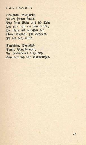 | Keywords: Joachim Ringelnatz - Gedichte dreier Jahre 047.jpg Scans of the book Gedichte dreier Jahre by Joachim Ringelnatz 1883 - 1934 http //www ub uni-bielefeld de/diglib/2006/ringeln_dreierjahre/ 1932 Creator Joachim Ringelnatz PD-old Ringelnatz - Gedichte dreier Jahre |