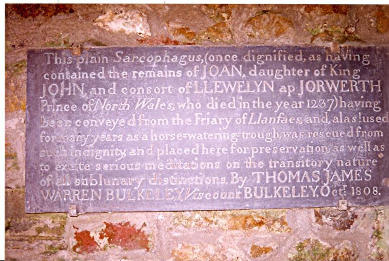 Keywords: Joan, Lady of Wales, grave.jpg en Slate panel above grave of Joan Lady of Wales Beaumaris Church Anglesey own Cate228 1999-05 Church of St Mary and St Nicholas Beaumaris monuments Joan Lady of Wales May 1999 in Wales Churches in Wales photographed in 1999 May 1999 photographs Plaques referencing 1237 Plaques referencing 1808 |