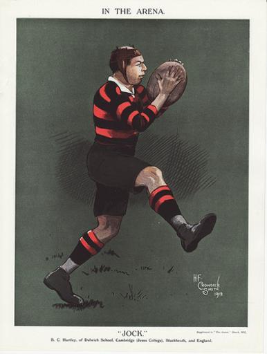 | Keywords: Jock Hartley.jpg en Cartoon of Bernard Charles Jock Hartley England rugby union player from Arena Magazine in 1912 http //rugby-pioneers blogs com/rugby/2007/06/bchartley_black html H F Crowther Smith 1912-03 pd-old Rugby union players from England |