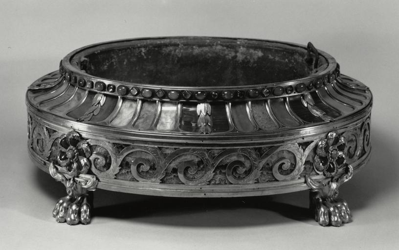 | Keywords: Johann Christian Neuber - Stand or socle for a figural group - Walters 541909.jpg The tradition of mounting specimen stones can be traced to 16th-century Florentine pietra dura work In the late 1700s techniques for slicing and polishing stones were perfected allowing lapidaries most notably the Dresden goldsmith Johann Christian Neuber 1736-1808 to produce masterpieces in which concentric radiating patterns of specimen hardstones were set in lids of snuffboxes and circular tabletops In this work the skeleton of the container is in gilded bronze with Roman motifs including scroll patterns paterae saucer-shaped appliqués and paw feet The body is lined with sheets of pink amethyst with traces of fluorite and the rim is decorated with alternating carnelians and foil-backed amethysts Set in the frame are sheets of dark brown agate light brown spotted petrified wood tan agate pink agate and white marble The paterae have centers of banded agate and borders of jasper late Other date century 18 gilded bronze amethyst agate jasper petrified wood carnelians marble cm 16 5 48 9 41 accession number 54 1909 34494 Frédéric Auguste III 1750-1827 Elector of Saxony date and mode of acquisition unknown Nicolai Wasilijewitsch Repnin 1732-1801 1779 by gift with thanks for his role in the negotiation of the Peace Treaty of Teschen Alexandre Polovtsoff Aleksandr Aleksandrovich Polovtsov Paris date and mode of acquisition unknown Henry Walters city Baltimore Walters Art Museum Henry Walters Acquired by Henry Walters 1929 The Fabergé Menagerie The Walters Art Museum Baltimore; Columbus Museum of Art Columbus; Portland Art Museum Portland 2003-2004 place of origin Dresden Germany Walters Art Museum license Bronze objects Animal feet in art Johann Christian Neuber Collections of the Walters Art Museum Nicholas Repnin |