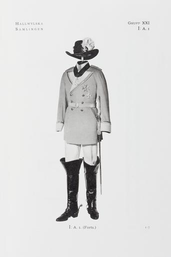 | Keywords: Johanniterordensdräkt tillhörande Walther von Hallwyl - Hallwylska museet - 89082.tif JOHANNITERORDENSDRÄKTER <br/><br/>Bestående av delar av ordensdräkt för Ehrenritter samt ordensdräkt för Rechtsritter Delar av ordensdräkt för Ehrenritter Bestående av hatt epåletter med fodral värja med balja samt ett par sporrar <br/><br/>Hatt Av svart silkesfelb på styv stomme Trekantig vitplymascherad Agraff av guldbuljoner bestående av två spirallindade kantiljer lagda med krus den ena av förgylld rund metalltråd massiv den andra av oförgylld platt dylik tråd guldlan samt med en förgylld knapp med ordenskorset i silver Foder av vitt siden merveilleux Mått Vidd 56 cm Brätte längd 10 5 cm Epåletter axelstycken ett par med fodral Av metall i form av en oval skiva med rektangulär platt flik med fasade hörn Skivans sidor med stoppning Epålettens översida överklädd med guldtyg undersidan med röd ylleflanell På flikens översida en förgylld knapp med ordenskorset i vit emalj avnött på undersidan en mycket lång hake av mässing Axelholk av papp insidan överklädd med höggul sammet; på utsidan tätt vertikalt liggande guldbuljoner hårt dubbeltvinnade kantiljer Mått Längd 16 cm ; höjd 8 cm Fodral Av papp med trycklock samt på utsidan klätt med mörkt blågrönt knottrigt papper 8-formigt Locket fodrat med ljust blågrönt moirépapper lockets och fodralets kanter med likafärgat slätt papper Fodralets botten och sidor inuti vadderade samt fodrade med ljusgult fyrskaftat bomullstyg Under botten mörkblått papper Mått Höjd 10 cm ; längd 32 cm ; bredd 19 cm Värja med balja Klinga av stål blankpolerad tveeggad jämnt avsmalnande mot udden med sexsidigt tvärsnitt plana sidor och spetsig udd På klingans övre del i blankt mot mattetsad botten på vardera sidan akantusbladorneringar i tre grupper den övre och den nedre med en trofégrupp dessutom på mellersta gruppen på insidan preussiska örnen jämte ett i S-form gående skriftband varpå MIT GOTT F KÖNIG U VATERLAND Fäste av förgylld mässing Parerplåt hjärtformig skålig med bred ytterkant samt med den spetsiga ändan uppsvängd Mellan klingan och parerplåten två röda yllelappar Handbygel bågformig med ovalt tvärsnitt samt med nedre änden fortsättande på den bygeln motsatta sidan i en kort parerstång med tvär ytterände och avsmalnande inåt Kavel av trä spolformig med ovalt tvärsnitt samt lindad med höger- och vänstertvinnad grövre och finare tråd av silver Knapp långsträckt päronformig med övre ändan avslutad i en platt ändknapp på insvängd hög hals; på knappens utsida fritt pålagt i silver ordenskorset Mått Längd 0 95 m Klinga bredd vid fästet 1 5 cm Fäste längd 13 9 cm Balja Av svartlackerat läder med munbleck och släpsko av förgylld mässing Längs baksidan en grov spannad söm Munbleck och släpsko släta det förstnämnda med snett utvikt mynningskant samt på framsidan en nedåtriktad lång hake avsmalnande nedåt Mått Längd 0 81 m ; bredd 2 2 cm Munbleck längd 9 2 cm Släpsko längd 11 5 cm Sporrar spännsporrar ett par Av förgylld mässing Bygeln klackbågen med något uppsvängda skänklar trefasad utsida och platt insida samt avsmalnande utåt på vardera ändan en kullrig knapp på rakt utstående lång rundstavig hals Remmar saknas Mått Längd 12 5 cm ; bredd 10 9 cm Ordensdräkt för Rechtsritter Bestående av hatt mantel vapenrock livrem med gehäng värja med balja ordensband byxor stövlar sporrar med vristskydd block samt koffert med nycklar och överdrag Hatt Av svart styv filt med på sidorna uppviket brätte kantat med ett svart sidenmoiréband samt uppåt avsmalnande platt hög kulle nedtill denna en tjock snodd av förgylld metalltråd baktill med två öglor samt två tofsar av guldbuljoner tofshuvudet horisontalt lindat med dylika buljoner Framtill en vit och en svart lång strutsplym liggande över kullen och fäst under en kokard av hoprynkat svart sidenmoiréband varpå ordenskorset av vitt linnetyg Foder av vitt siden merveilleux ; svettrem av ljust beigefärgat getskinn baktill med en rosett av silkestrikåband i samma färg Mått Vidd 57 cm Kulle höjd 14 5 cm Brätte bredd 10 5 cm Mantel Av svart siden taft Hand- och maskinsydd Rektangulär i tre raka våder Övre kortsidan med fyra täta rynkrader utom på ett stycke vid vardera framkanten Foder av tunnare svart siden taft isytt med snoddade ytterkanter Halslinning smal dubbelviken Mått Längd 150 cm ; halsvidd 50 cm Vapenrock Av scharlakansrött kläde med knappar av förgylld koppar Livskuren tvåradig med tre par knappar Framstyckenas kanter passpoaler av vitt kläde Axelklaffar flätade av galonband i guld och med ordenskorset samt fodrade med rött kläde Krage rockslag ärmuppslag jämte skörtklaffar av vitt kläde Krage hög dubbelviken rockslag stora tresidiga ärmuppslag höga skörtklaffar konturerade de senare vardera med tre knappar jämte en smal guldgalon de övriga med en bred och en smal dylik Knappar runda kupiga med ordenskorset i relief baksidan av vit metall med en rundstavig ögla På vänstra framstycket en kort horisontal uppslitsning med fällklaff för värjan därovanför fyra horisontala silkesstränsar ordensfästen Foder av vitt siden i detsamma under vardera bakskörtet en ficka Mått Ärmhålsdjup 23 cm ; livlängd 42 cm ; längd hel 76 cm ; ryggbredd halv 18 cm ; ärmlängd 78 cm ; bröstvidd fram 44 cm ; bröstvidd hel 100 cm ; livvidd 90 cm Livrem med spänne och värjgehäng Remmen av grovt läder på utsidan ett pålagt band vävt av fina guldtrådar bildande fem längdgående flacka stavar omväxlande med smala ränder i hålmönster; insidan fodrad med rött kläde; remmens ena ände trubbvinklig på denna en fyrsidig sölja av mässing fastsydd med en kort läderflik samt avsedd för en på livremmens insida befintlig smal rem med mörkröd utsida och nio spännhål samt med innerändan fastsydd vid livremmen Spänne av för