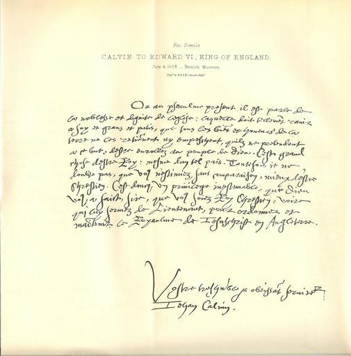 | Keywords: John Calvin's handwriting 01.jpg Facsimile of French manuscript letter written by John Calvin to king Edward VI of England July 4 1552 From the British Museum Foldout is 8 3/4 x 8 7/8 in Letters of John Calvin Compiled from the Original Manuscripts and Edited with Historical Notes by Dr Jules Bonnet translated from the Latin and French Languages by David Constable vol 1 1855 Edinburgh Thomas Constable and Co 1855 John Calvin 1509-1564 Old Public domain Text of manuscript excerpt French Or au pseaulme present il est parlé de la noblesse et dignité de l ™Eglise laquelle doibt tellement ravir à soy et grans et petits que tous les biens et honneurs de la terre ne les retiennent ny empeschentqu ™ils ne prétendent à ce but d ™estre enroliez au peuple de Dieu C ™est grand chose d ™estre Roy mesme d ™un tel pais; toutefois je ne doubte pas que vous n ™estimiez sans comparaison mieux d ™estre chrestien C ™est doncq un privilège inestimable que Dieu vous a faict Sire que vous soyez Roy chrestien voire que vous luy serviez de lieutenant pour ordonner et maintenir le royaulme de Jésus-Christ en Angleterre http //books google com/books id zLkPAAAAQAAJ pg PA347 dq 22et+maintenir+le+royaulme+de+J C3 A9sus+Christ+en+Angleterre++++ 22 lr client firefox Jean Calvin Lettres Françaises 1854 Jules Bonnet ed Paris Libbairie De Ch Meyrueis et Compagnie vol 1 pp 346-347 French Letters A D 1538 “ 1554 English Now in the Psalm before us is set forth the grandeur and dignity of the church which ought in such wise to draw over to itself both great and small that all the riches and honours of the world cannot hold them back nor keep them from aiming at this object namely to be enrolled among the people of God It is a great thing to be a king especially of such a country; yet I have no doubt but that you esteem it incomparably better to be a Christian It is therefore an inestimable privilege that God has made you sire a Christian king to the end that you may act as his vicegerent in maintaining the kingdom of Jesus Christ in England http //books google com/books id f5hhAAAAIAAJ pg PA714 dq 22Psalm+before+us+is+set+forth+the+grandeur+and+dignity+of+the+church 22 lr PPA715 M1 Original letters relative to the English reformation written during the reigns of King Henry VIII King Edward VI and Queen Mary chiefly from the archives of Zurich Hastings Robinson Parker Society Great Britain 1847 Cambridge The University Press vol 2 pp 714-715 This volume forms the third series of the Zurich letters and includes letters from 1531 to 1558 PD-old Letters by Jean Calvin Handwriting |