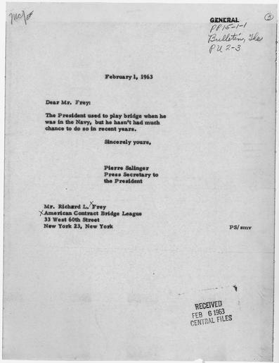 | Keywords: John F. Kennedy and Bridge - NARA - 194145.tif Scope and content Letter indicating that President Kennedy played bridge in the Navy General notes 194145 Local identifier President 1961-1963 Kennedy Office of the President 01/20/1961 - 11/22/1963 John F Kennedy Library NLJFK Columbia Point Boston MA 02125-3398 1963-02-01 Record group Collection JFK-WHCF Papers of President Kennedy White House Central Files 01/20/1961 - 11/22/1963 Record group ARC 1176 Papers of President Kennedy White House Central Files White House Subject File compiled 01/20/1961 - 11/22/1963 Series ARC 194123 File unit Papers of President Kennedy White House Central Files White House Subject Files President 01/20/1961 - 11/22/1963 File unit ARC 194144 Variant control numbers NAIL Control Number NLK-WHCF-SBJCTFL-PP1511GCARDGAME-LTRREJFKCRDGME yes Other versions NARA-cooperation PD-USGov Documents in English Documents related to John F Kennedy |