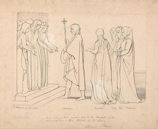 Keywords: John Flaxman - Illustration to Pilgrim's Progress - Google Art Project.jpg <nowiki>Inscribed in gray ink lower center Christian Discretion Charity Piety Prudence ; in gray ink lower center And many of them meeting turn at the threshold of the house said Come in Thou Blessed of the Lord; Pilgrim's Progress </nowiki> Inscription _Signed_and_Dated Signed and dated in gray ink lower left J Flaxman 8 June 1792 Not on view Black ink on medium slightly textured cream wove paper women crosses motifs men ceremonies procession steps robes historical subject special url_id JQF8IBNPOY48-w PD-old-100-1923 1826 John Flaxman Google Art Project works by John Flaxman Pilgrim's Progress |