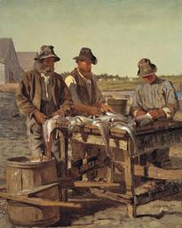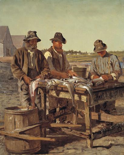 Keywords: John George Brown - Cleaning fish.jpg Artwork Creator John George Brown 1877 oil canvas in 24 5 19 5 Private collection accession number object history credit line exhibition history J G Brown N A / 1877 ~ lower right signature / date 1 source <br/>2 http //montgomerygallery com/art/artwork asp key 832 Montgomery Gallery San Francisco PD-old-auto-1923 1913 John George Brown 19th-century paintings of seaworkers and fishermen Cleaning fish Fish processing in the United States Fish in art Fishermen's clothing |