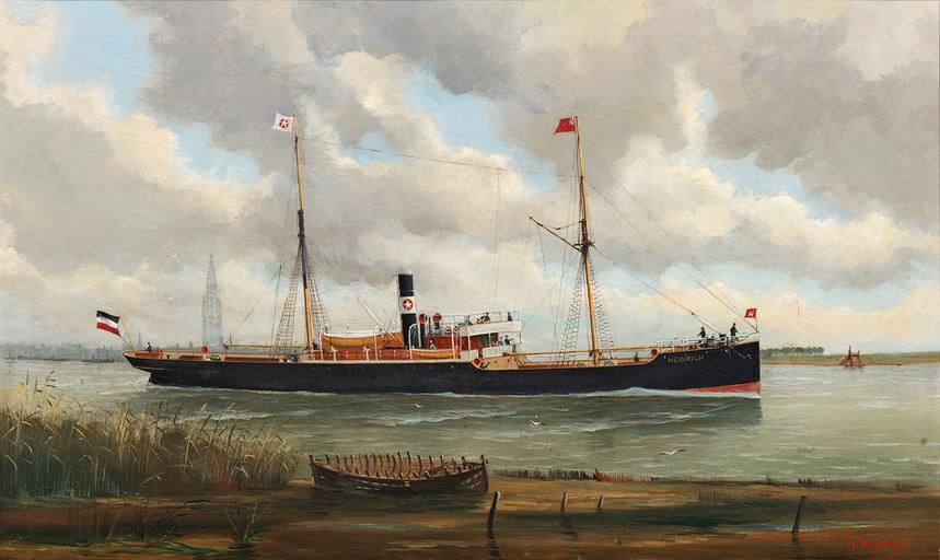 Keywords: John Henry Mohrmann Kapitänsbild des Schraubendampfers Heinrich.jpg Kapitänsbild des schonergetaktelten Schraubendampfers Heinrich in der Schelde vor Antwerpen Die Heinrich wurde 1883 bei Ramage Ferguson in Leith/Schottland gebaut und fuhr für die Hamburger Reederei F J Reimers oil on canvas signed lr 60 cm x 100 cm http //schloss-ahlden de/ Kunstauktionshaus Schloss Ahlden ~ 1905 Creator John Henry Mohrmann PD-old-auto-1923 1916 Images from Kunstauktionshaus Schloss Ahlden John Henry Mohrmann Steamships of Germany Steamships in paintings 20th-century oil paintings of ships Paintings of Antwerp |