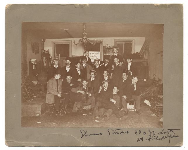 | Keywords: smithsonian institution smithsonianinstitution ashcan school ashcanschool john sloan johnsloan artist artists painter group portarit studio philadelphia artists philadelphiaartists artistas pintores retratos men vintage photograph philadelphia sloan archives of american art archivesofamericanart monochrome Description: Sloan pictured among a group of his friends at his studio in Philadelphia. Photographer unknown. [Also filmed on reel 950, fr. 502, Everett Shinn papers]. Sloan, John, 1871-1951 Creator/Photographer: Unidentified photographer Medium: Black and white photographic print Dimensions: 26 cm x 21 cm Date: 1898 Persistent URL: www.aaa.si.edu/collections/images/detail/john-sloan-his-s... Repository: Archives of American Art Collection: Everett Shinn collection, 1894-1953 Accession number: aaa_shinever_5208 Description: Sloan pictured among a group of his friends at his studio in Philadelphia. Photographer unknown. [Also filmed on reel 950, fr. 502, Everett Shinn papers]. Sloan, John, 1871-1951 Creator/Photographer: Unidentified photographer Medium: Black and white photographic print Dimensions: 26 cm x 21 cm Date: 1898 Persistent URL: www.aaa.si.edu/collections/images/detail/john-sloan-his-s... Repository: Archives of American Art Collection: Everett Shinn collection, 1894-1953 Accession number: aaa_shinever_5208 |